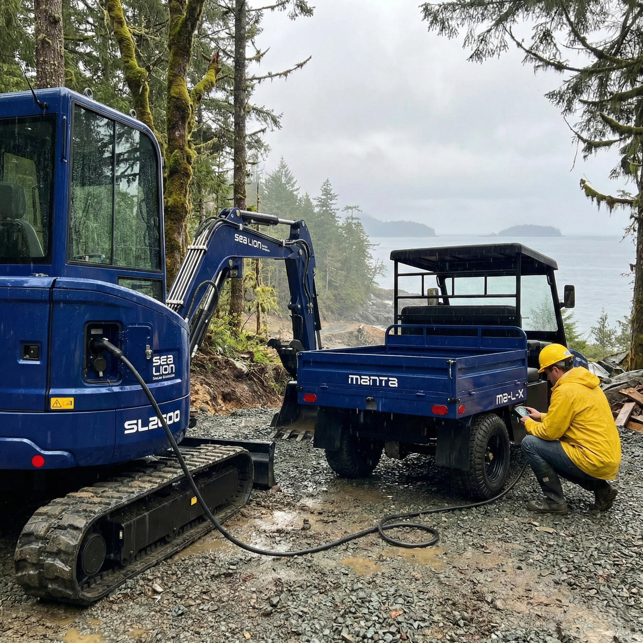 Pictured here is the Sea Lion ecosystem in action. The Manta UTV provides high-speed field charging to the SL2600 Excavator, ensuring we run at full capacity regardless of how remote the site is.This is the future of construction. Silent. Clean. Relentless.Ask us about the sealion.ca equipment suite and how these machines can work for you.